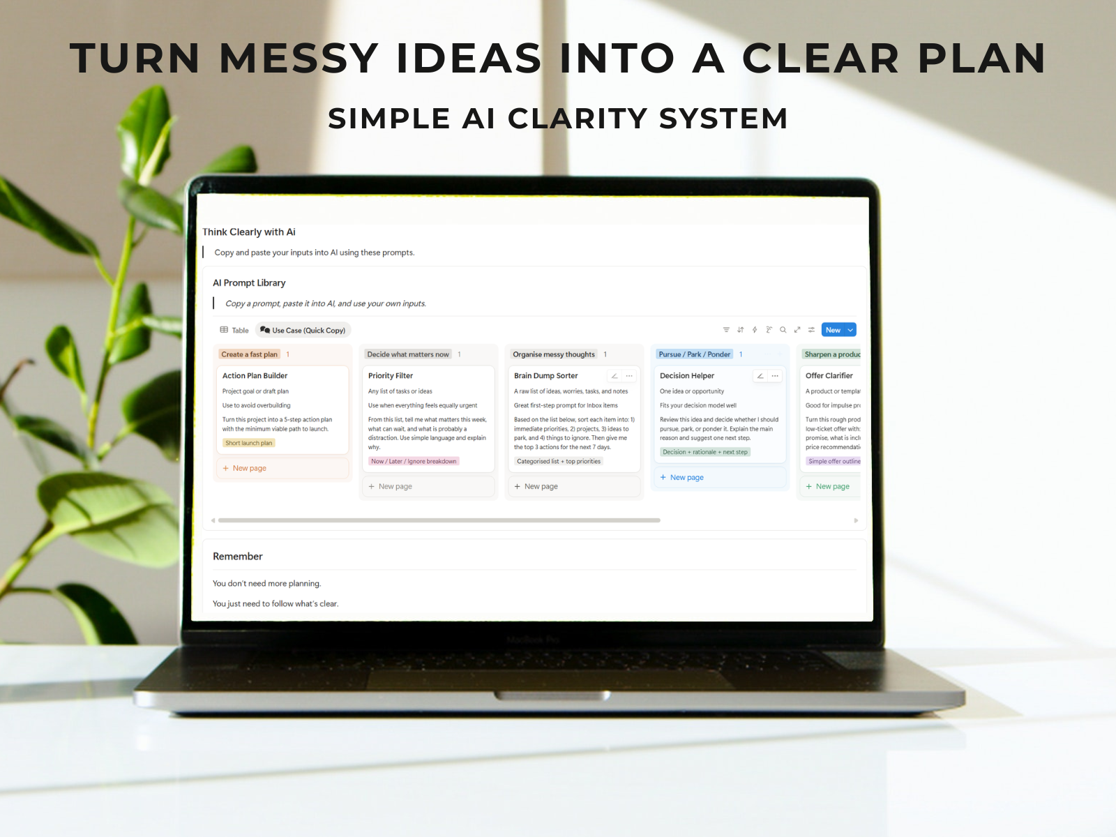 Idea to Plan System is enhanced with AI prompts, this system helps you to capture everything on your mind, filter what actually matters, turn ideas into a clear, actionable plan and take focused next steps. You’ll have a structured process that brings clarity and direction fast.